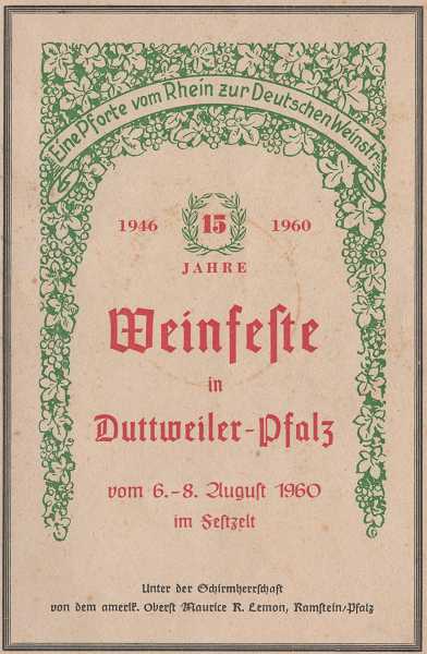 Die Festschrift wurde anlässlich des Duttweiler Weinfestes 1960 herausgegeben. Sie enthält Grußworte, Festprogramm und viele zeitgenössische Anzeigen (siehe auch unter Duttweiler Weinfest. Das Heft ist vollständig erhalten und in einem guten Zustand.