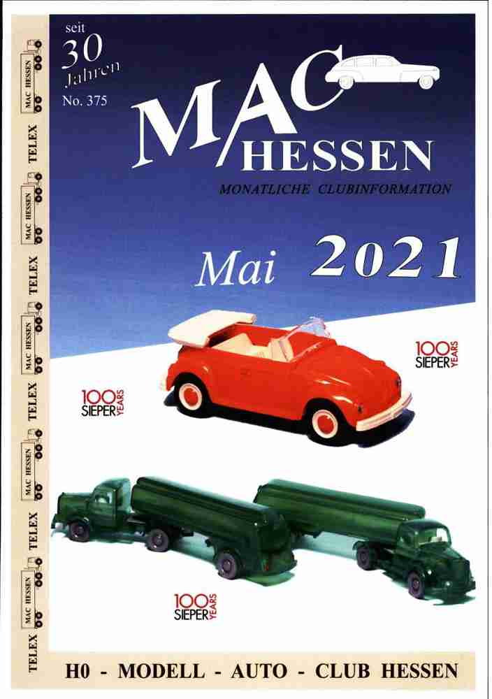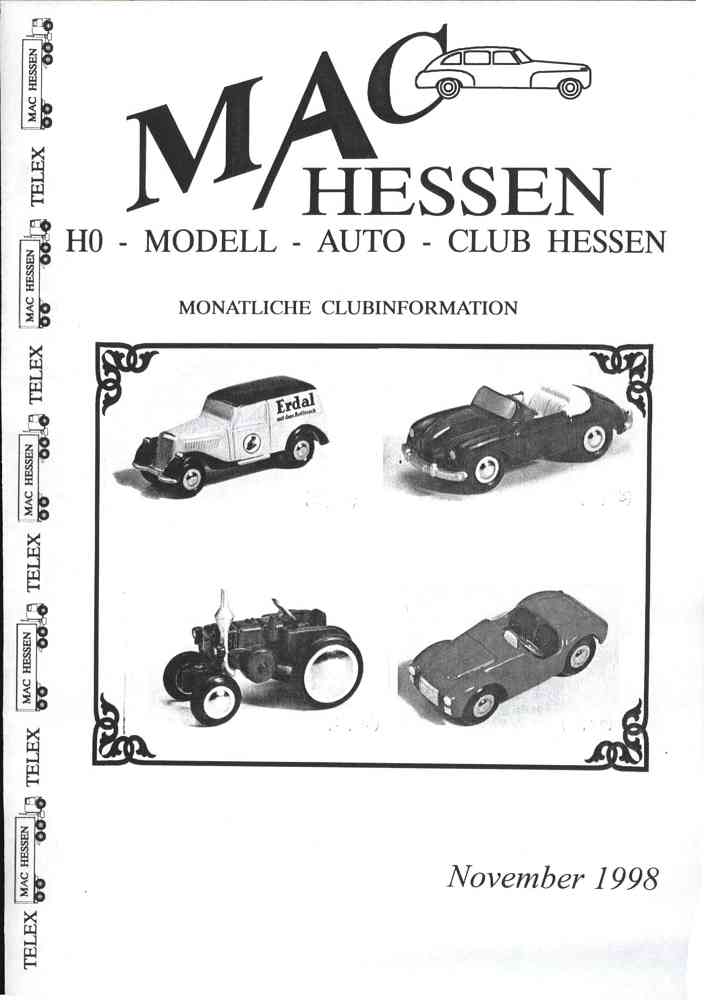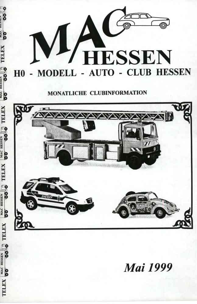 Nach dem Beinahe-Aus des CAM (Club der H0-Auto-Modellfreunde) haben sich die Aktiven mehrerer CAM-Regionalgruppen entschlossen, eigene Vereine zu gründen, so auch im Rhein-Main-Gebiet der Modellauto-Club Hessen. Ich habe mich diesem im Januar 1990 gegründeten Verein angeschlossen. Auch er gibt eine monatlich erscheinende Mitgliederzeitschrift heraus. Der MAC-Telex besteht hauptsächlich aus Modellbeschreibungen von Neuheiten und erscheint zwölf mal pro Jahr. www.mac-hessen.de/